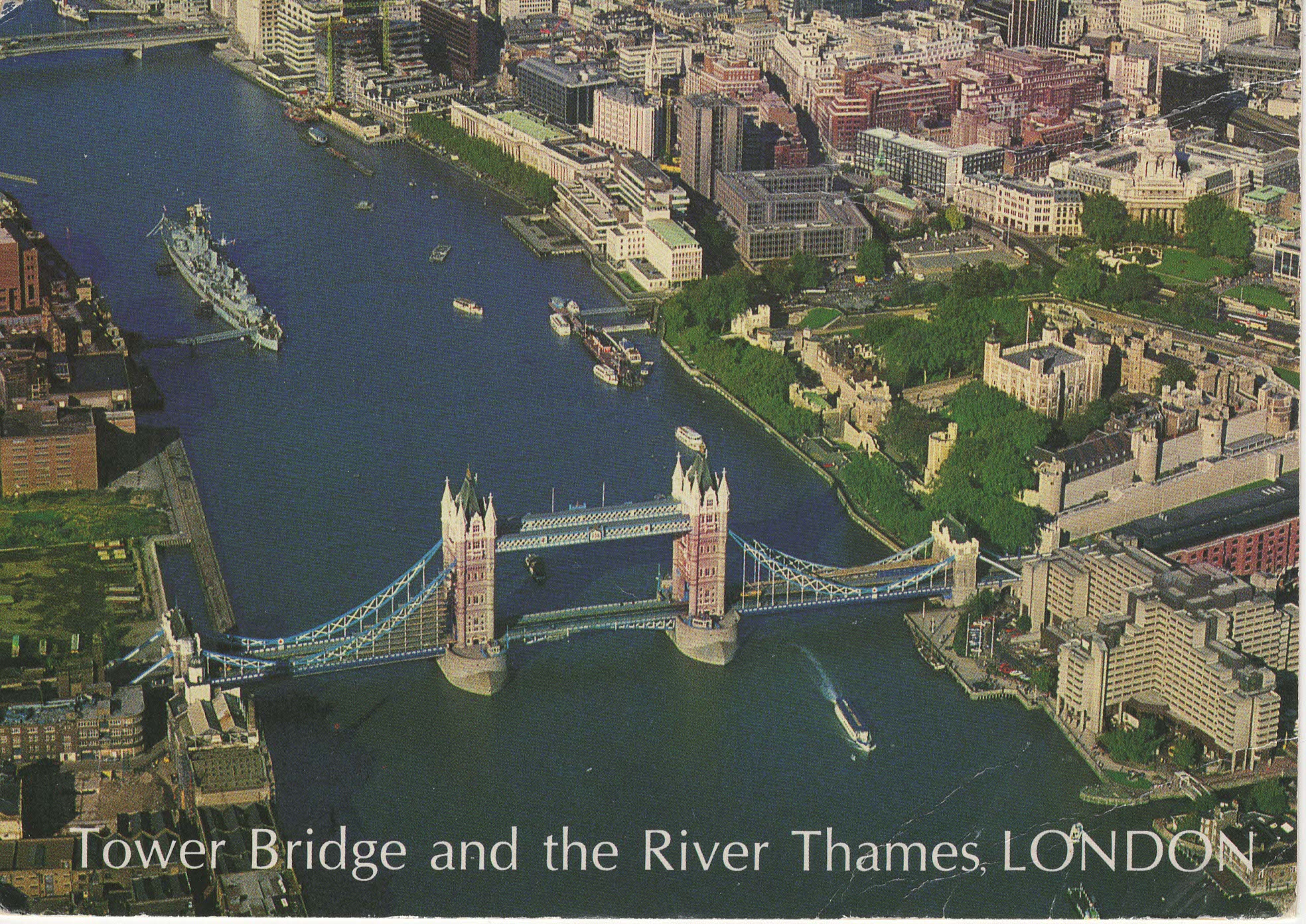 - Popis: Letecký pohled na Temži a Tower Bridge, pohled lehce ohnutý v pravém dolním rohu.