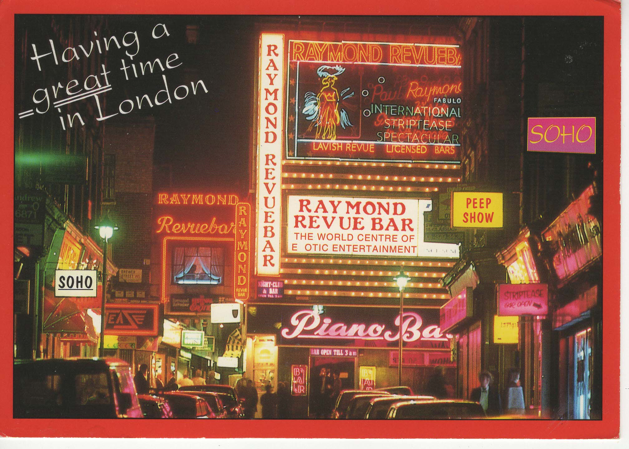 - Popis: Poměrně zachovalá, s nalepenou cenovkou 40p. Vydána před rokem 2004, kdy zavřeli Raymond Revuebar. Foceno cca z místa 52 Rupert street. Na přední straně je text "Having a great time in London".