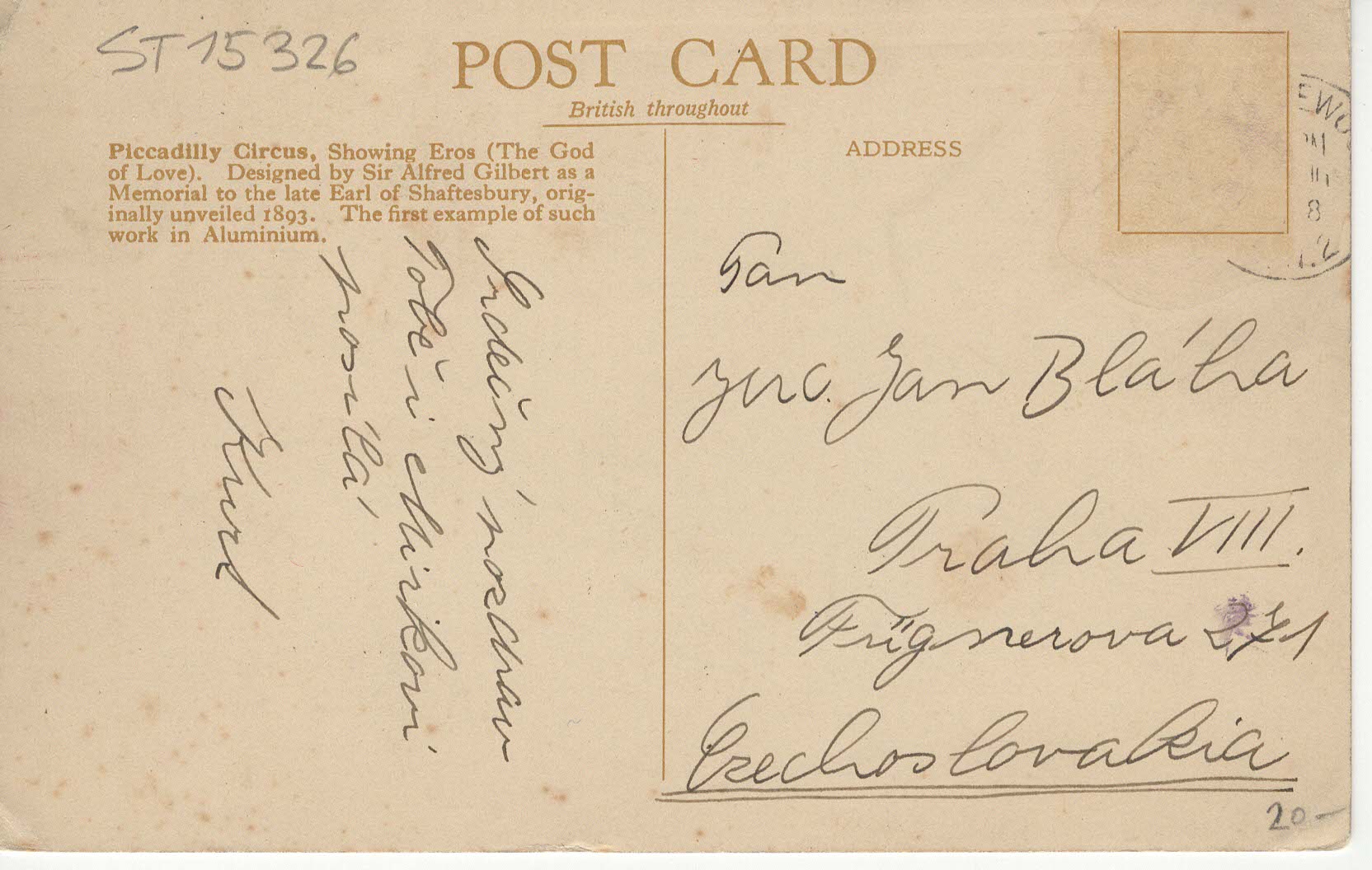 Skvěle zachovalá, bohužel je stržená datumovka. Na internetu jsem našel stejnou, s datumem 1935, proto řadím do 30. let. Na přední straně text "Piccadilly Circus, London, Showing Eros".
